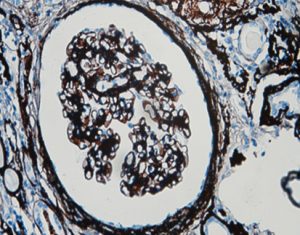The Periodic Acid-Silver Metheramine Staining method is of great diagnostic value for observing various morphological changes of the glomerular mesangium and basement membrane. It could not be replaced by other special staining method, especially for observing the formation of the nail of the substrate membrane in the membranous nephropathy and the double or multi-track changes of the amyloidosis nephropathy basement membrane.