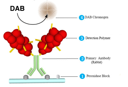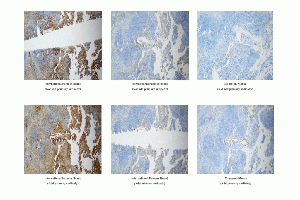 The MicroStacker™ technology allows well-controlled layered stacking of F(ab’) fragments of IgG secondary antibody and peroxidase enzymes on a micro-polymer scaffold, which results in a compact polymeric structure with superior sensitivity compared to other conventional HRP polymers with bulky dextran backbones. This system avoids the use of streptavidin and biotin, and therefore eliminates non-specific staining as a result of endogenous biotin. Herein, the Mouse-on-Mouse Polymer comprises of specially engineered anti-Mouse secondary antibody to eliminate the high backgrounds caused by endogenous mouse antibodies in mouse tissues.