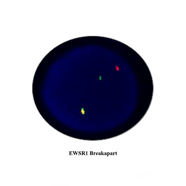 Ewing’s Sarcoma is a small, round, blue cell tumour belonging to the family of primitive neuroendocrine tumours. In over 85% of cases a translocation between chromosome 22 and 11 is seen (EWSR1 gene fuses with FLI1 gene). Other translocations also occur: t(7;22) and t(21;22). A break-apart probe indentifies all cases with break in the EWSR1 gene region. This covers all translocations in Ewing’s Sarcoma helping in differential diagnosis between ES and rhabdomyosarcoma.