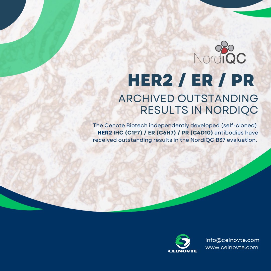 Celnovte Biotech is proud to announce our outstanding results in the 2024 NordiQC external quality assessment. Our independently developed antibodies, ER (clone: C6H7), PR (clone: C4D10), and HER2 (clone: C1F7), all achieved exceptional staining results in the Run B37 test. When paired with Celnovte’s MicroStacker™ secondary antibody polymer detection system, the detection of ER and PR provides better results. This achievement underscores our commitment to high-quality, cost-effective antibody production and our technical excellence in immunohistochemistry. We will continue to deliver superior products and services to pathologists worldwide.