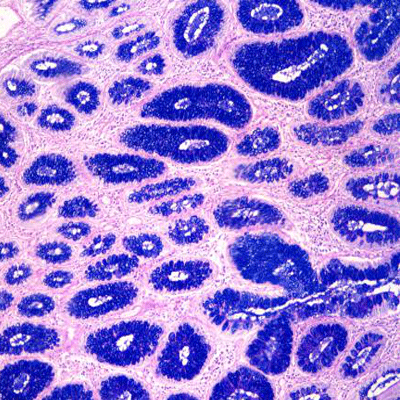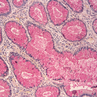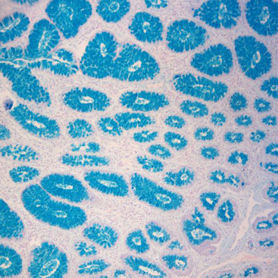 Alcian Blue: Alcian blue stains acid mucin (in acidic pH 2.5), such as sialomucin and sulphomucin. It stains mucin of the salivary glands, prostate and large intestine. Alcian blue also stains proteoglycans of cartilaginous material.